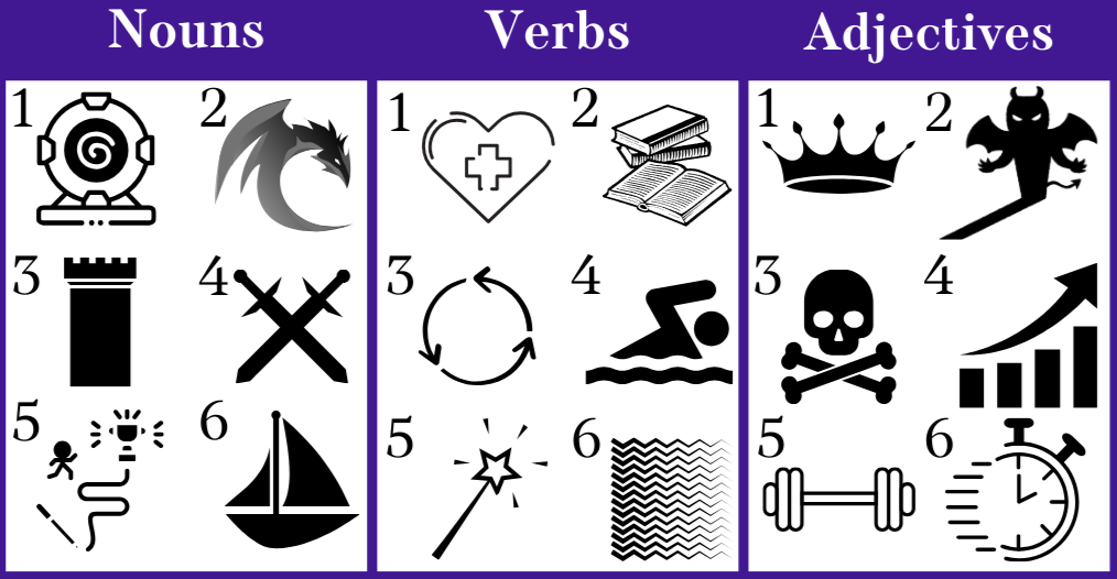 - Fantasy: Roll a six-sided die to choose one random picture of a noun, verb, and adjective from the lists below. Write a one-page story including all of those elements. (Put all three words in the same sentence for a challenge!)