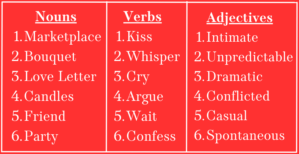 - Romance: From the list below, roll a six-sided die to pick a random noun, verb, and adjective. Write a one-page story including all of those elements. (For a challenge, put all three in the same sentence!)