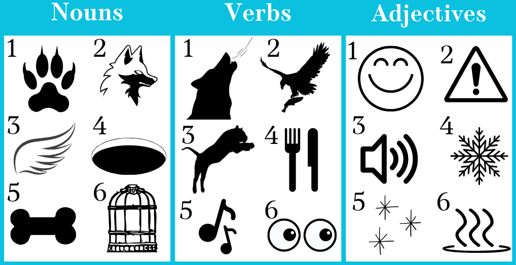 - Animal POV: Roll a six-sided die to choose one random picture of a noun, verb, and adjective from the lists below. Write a one-page story including all of those elements. (Put all three words in the same sentence for a challenge!)