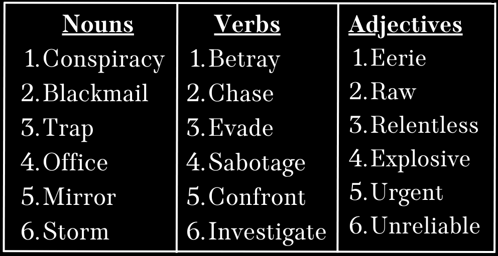 - Thriller: From the list below, roll a six-sided die to pick a random noun, verb, and adjective. Write a one-page story including all of those elements. (For a challenge, put all three in the same sentence!)