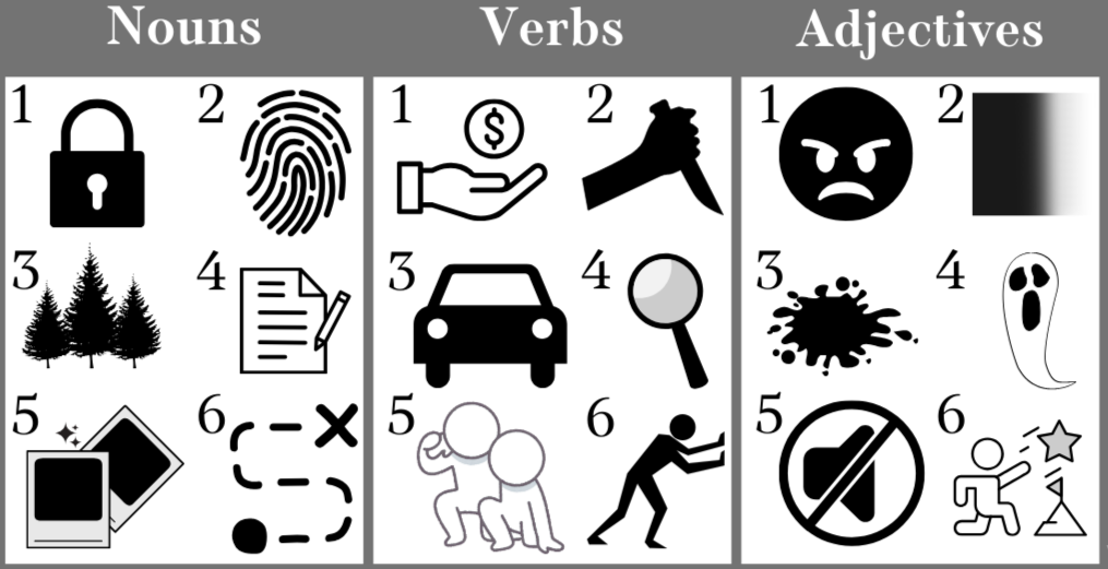 - Mystery: Roll a six-sided die to choose one random picture of a noun, verb, and adjective from the lists below. Write a one-page story including all of those elements. (Put all three words in the same sentence for a challenge!)