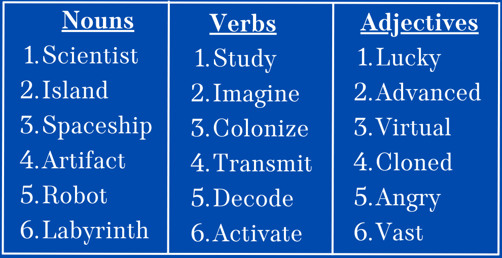 - Science Fiction: From the list below, roll a six-sided die to pick a random noun, verb, and adjective. Write a one-page story including all of those elements. (For a challenge, put all three in the same sentence!)