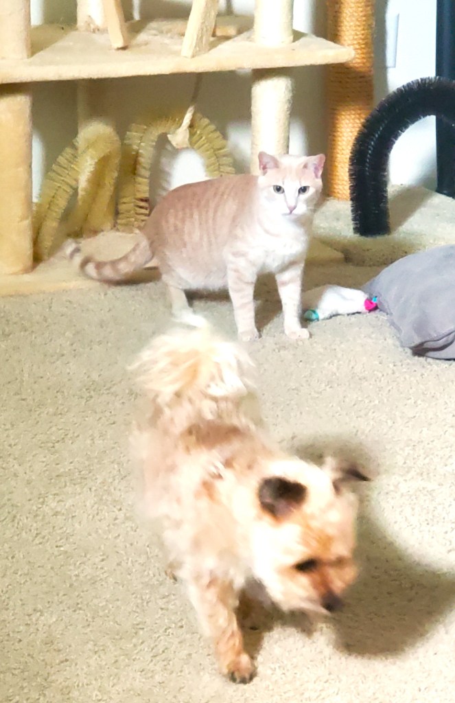 Earlier, I mentioned the Labrador who did zoomies in circles, but that’s not the only way to zoom. Back at the apartment, my cat brothers would sometimes join in! Quincy would wait in the hallway and bop me on the head (with his claws sheathed, of course) as I zoomed by. On the other hand, Quinton would wait near the living room, flick his tail, and then I’d chase him up the cat tree. Having cat brothers is so fun!