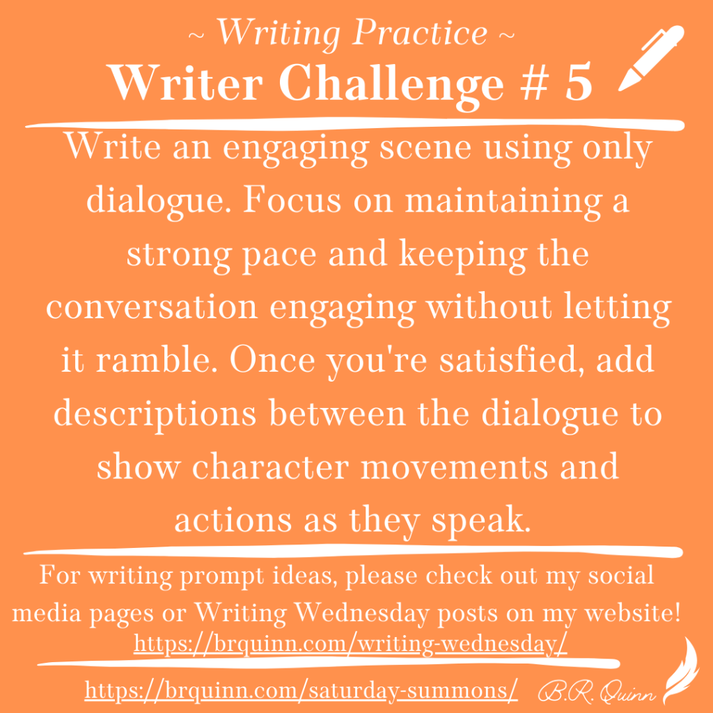 - Write a scene using dialogue only — keep the pace strong and engaging. No rambling!